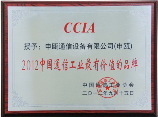 中國(guó)通信工業(yè)協(xié)會(huì)于2012年9月召開(kāi)的首屆中國(guó)通信工業(yè)品牌大會(huì)上,國(guó)家有關(guān)政府部門(mén)領(lǐng)導(dǎo)、地方政府領(lǐng)導(dǎo)、行業(yè)專(zhuān)家、行業(yè)用戶(hù)代表、國(guó)內(nèi)外銷(xiāo)售運(yùn)營(yíng)商及新聞媒體等共同參與表彰評(píng)選,申甌通信公司榮獲了2012中國(guó)通信市場(chǎng)最具影響力的行業(yè)品牌(全國(guó)排名第五位)