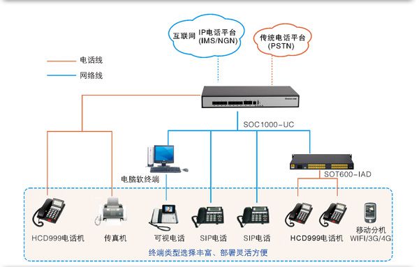 實(shí)現(xiàn)模擬話機(jī)、IP話機(jī)、IP視頻話機(jī)、電腦軟客戶端、手機(jī)客戶端、IAD等多終端接入。無論是在辦公室、會(huì)議室、出差途中、家中,還是在客戶現(xiàn)場,隨時(shí)隨地都能進(jìn)行溝通,讓溝通"無處不在"。